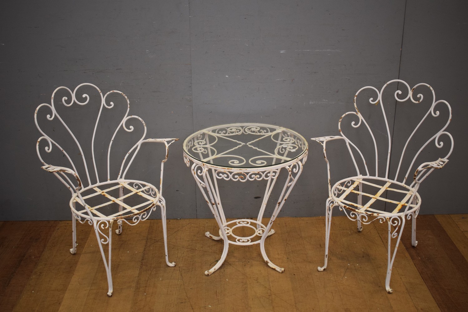 A FRENCH CIRCULAR PAINTED WHITE METAL OUTDOOR TABLE AND MATCHED CARVER CHAIRS - WITH GLASS TOP (A/F) (CHAIRS 87H x 64W x 50D CM) (PLEASE NOTE THIS HEAVY ITEM MUST BE REMOVED BY CARRIERS AT THE CUSTOMER'S EXPENSE. LEONARD JOEL STAFF CANNOT ASSIST CARRYING THIS ITEM) (X-LARGE ITEM)