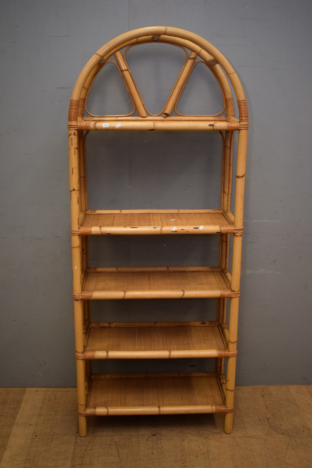 A FIVE TIER CANE AND BAMBOO SHELF WITH CURVED TOP (191H x 78W x 37D CM) (LEONARD JOEL DELIVERY SIZE: LARGE)