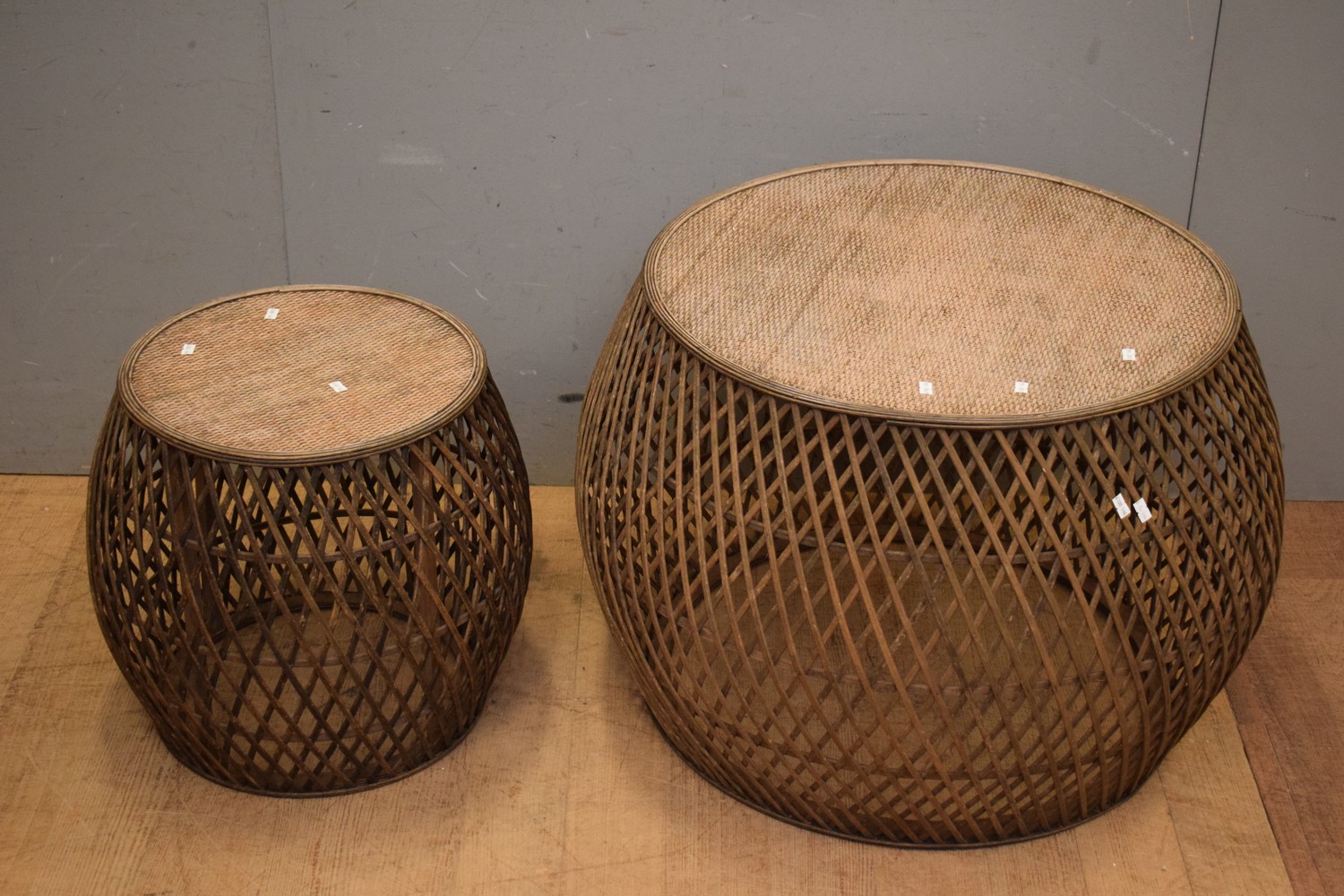 TWO CANE AND BAMBOO CIRCULAR TABLES (51H x 72D CM) (LEONARD JOEL DELIVERY SIZE: LARGE)