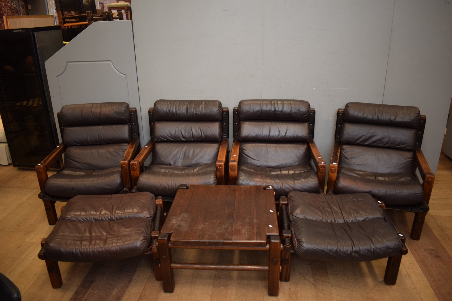 ANAUSTRALIAN MADE 1960S HEAVY WOODEN FRAME LEATHER SEVEN PIECE LOUNGE SUITE WITH MATCHED COGGEE TABLE (A/F) (90H x 73W x 81D CM) (PLEASE NOTE THIS HEAVY ITEM MUST BE REMOVED BY CARRIERS AT THE CUSTOMER'S EXPENSE. LEONARD JOEL STAFF CANNOT ASSIST CARRYING THIS ITEM) (X-LARGE ITEM)