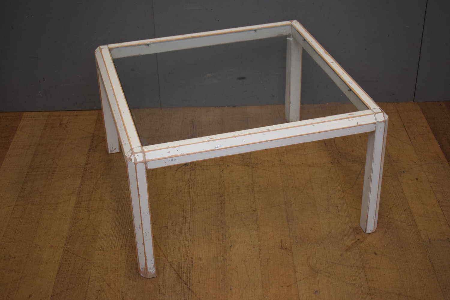 A PROVINCIAL SQUARE FORM SOLID WOODEN PAINTED WHITE AND GLASS TOPPED COFFEE TABLE (45H x 81W x 81D CM) (LEONARD JOEL DELIVERY SIZE: LARGE)