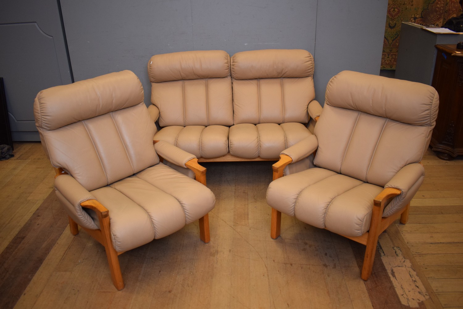 AN AUSTRALIAN MADE TESSA THREE PIECE LEATHER LOUNGE SUITE (LOUNGE 96H x 148W x 98D CM) (PLEASE NOTE THIS HEAVY ITEM MUST BE REMOVED BY CARRIERS AT THE CUSTOMER'S EXPENSE. LEONARD JOEL STAFF CANNOT ASSIST CARRYING THIS ITEM) (X-LARGE ITEM)