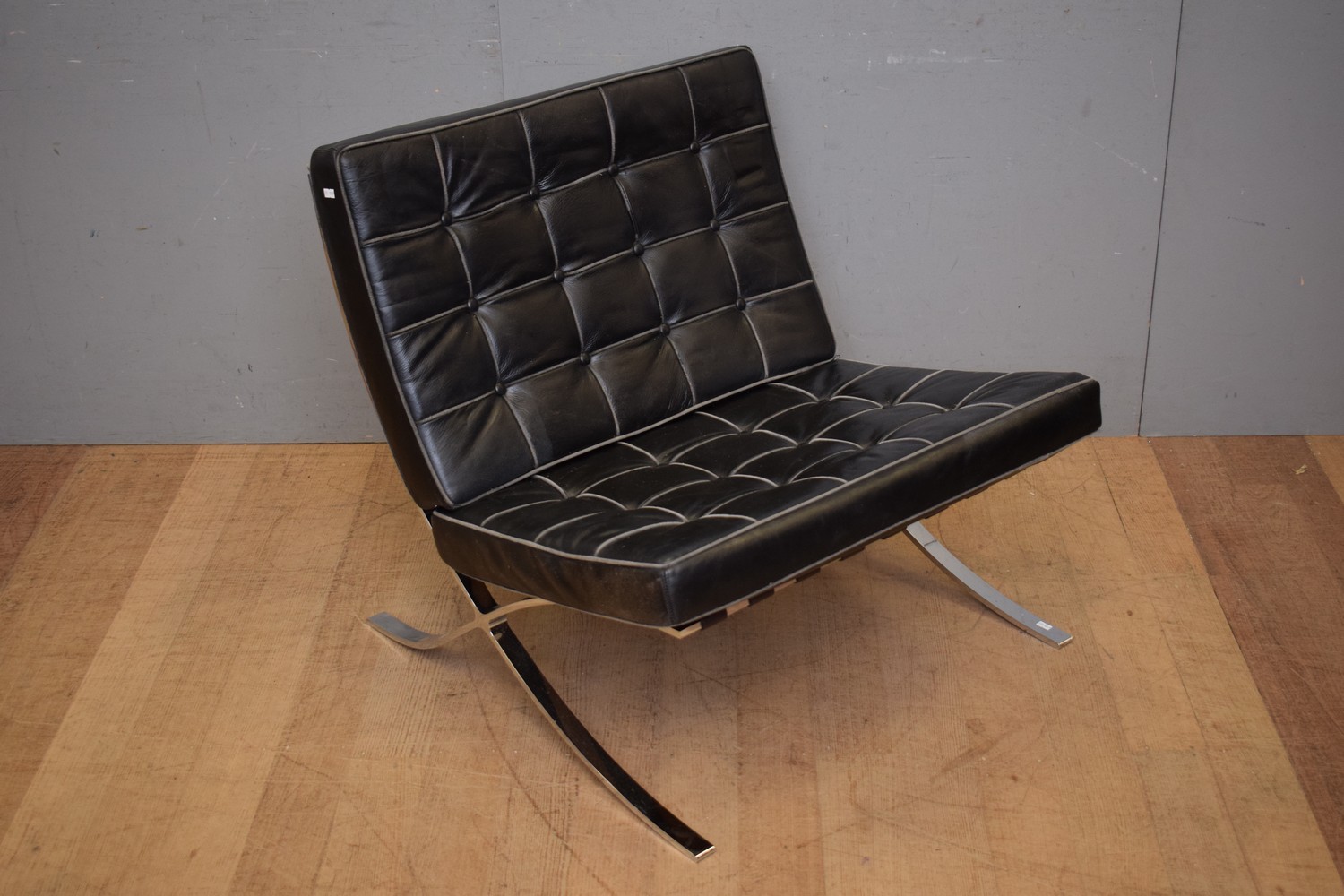 A CHROMED STEEL AND BLACK LEATHER BARCELONA STYLE CHAIR (77H x 77W x 76D CM) (LEONARD JOEL DELIVERY SIZE: LARGE)
