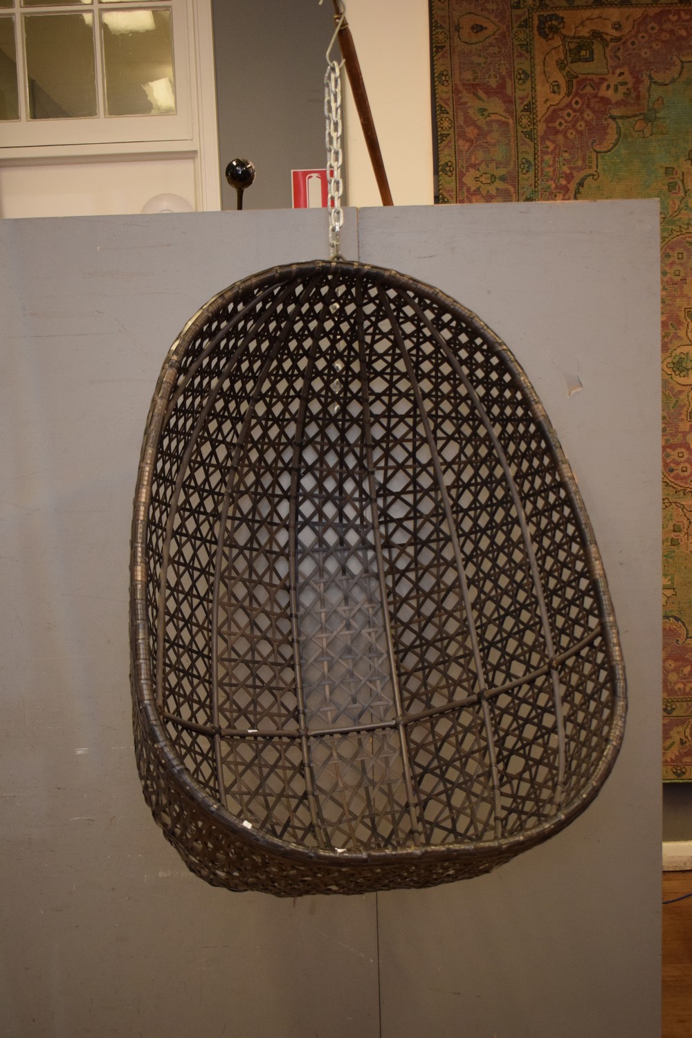 A STEEL FRAMED AND WOVEN PLASTIC HANGING CHAIR WITH HOOK AND CHAIN (115H x 82W x 60D CM) (LEONARD JOEL DELIVERY SIZE: LARGE)
