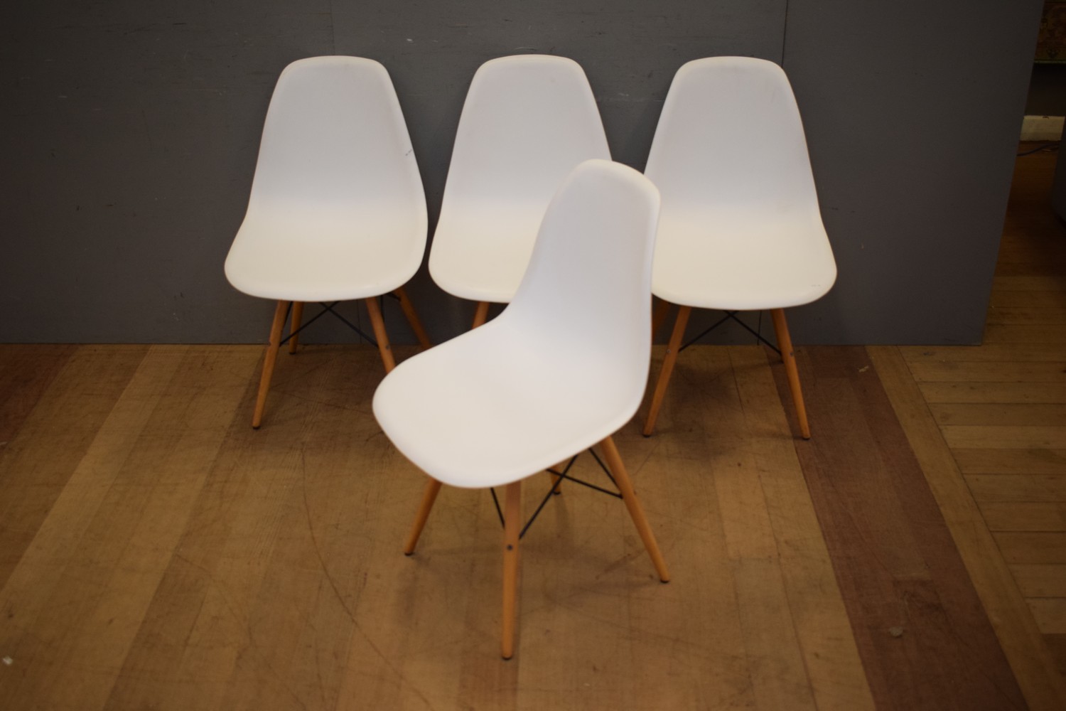 A SET OF FOUR CONTEMPORARY PLASTIC AND WOODEN LEGGED DINING CHAIRS (A/F) (82H x 48W x 48D CM) (LEONARD JOEL DELIVERY SIZE: LARGE)