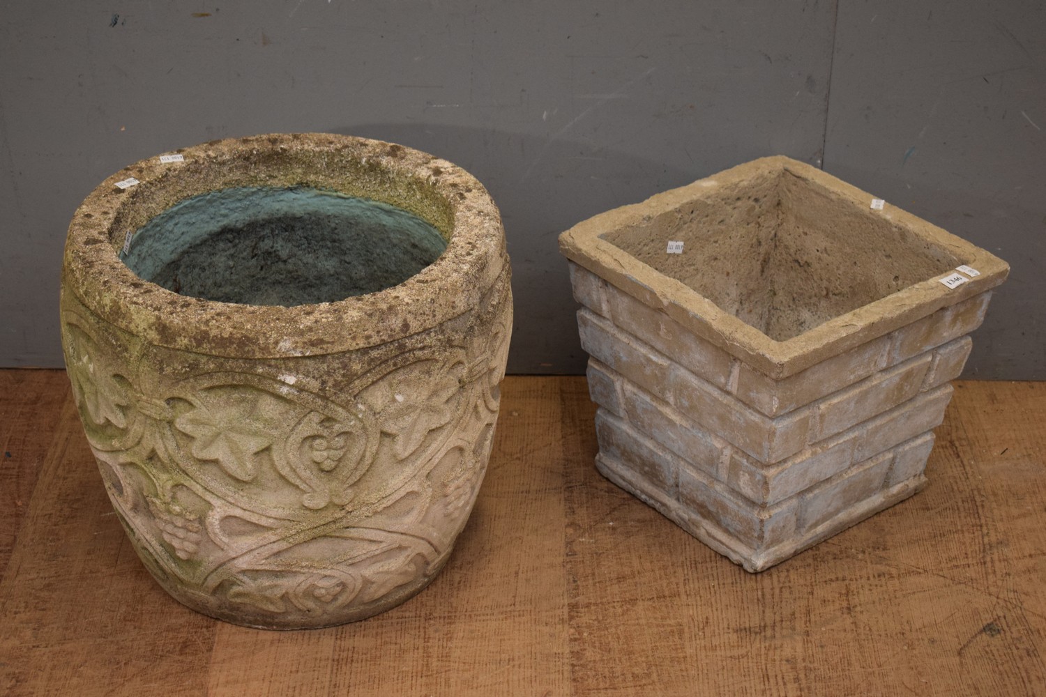 TWO AUSTRALIAN CONCRETE PLANTER POTS ONE WITH GRAPE AND LEAF DETAIL THE OTHER BRICK FORM (34H x 39D CM) (PLEASE NOTE THIS HEAVY ITEM MUST BE REMOVED BY CARRIERS AT THE CUSTOMER'S EXPENSE. LEONARD JOEL STAFF CANNOT ASSIST CARRYING THIS ITEM) (X-LARGE ITEM)