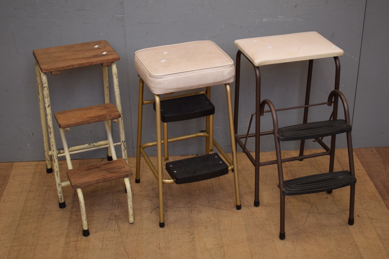 A GROUP OF THREE STEEL AND WOODEN AND VINYL SEATED FOLDING STEP STOOLS (69H x 37W x 60D CM) (LEONARD JOEL DELIVERY SIZE: LARGE)