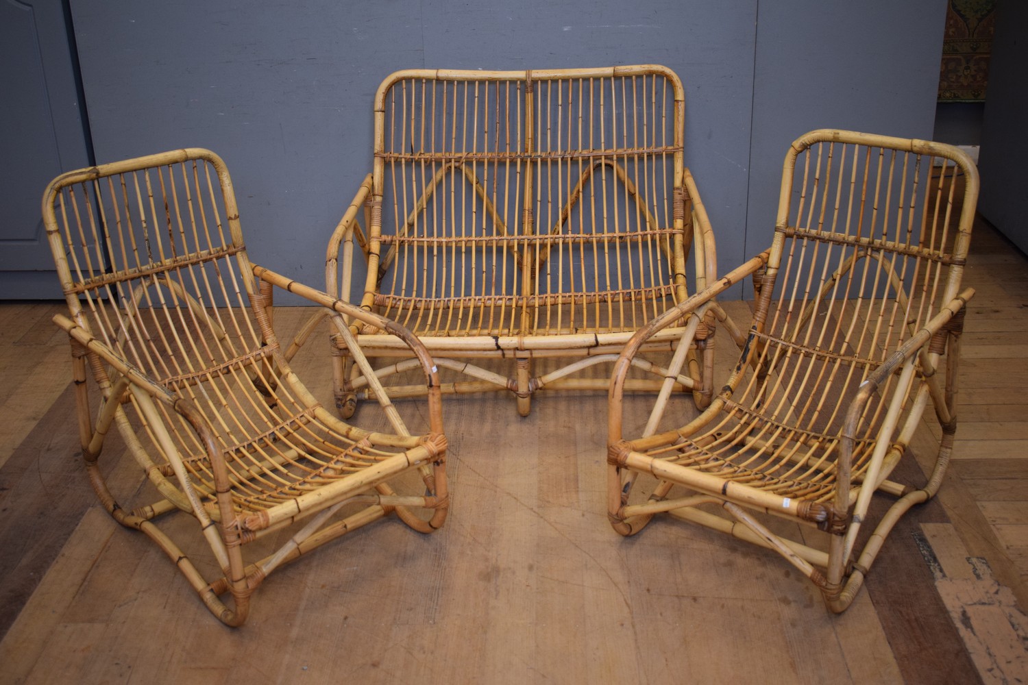 A THREE PIECE 1950S RETRO CANE LOUNGE SUITE (86H x 108W x 97D CM) (LEONARD JOEL DELIVERY SIZE: LARGE)