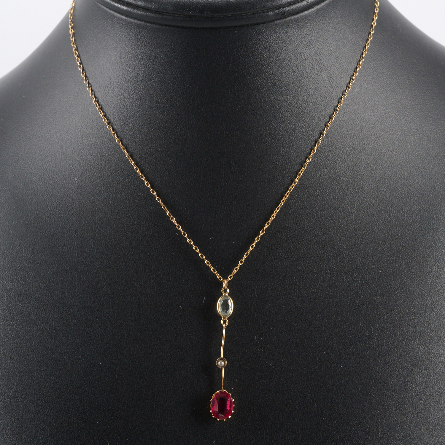 A GARNET, SEED PEARL AND TOPAZ PENDANT TO A FINE CHAIN, ALL IN 9CT GOLD, TOTAL LENGTH APPROXIMATELY 390MM, 2.23GMS