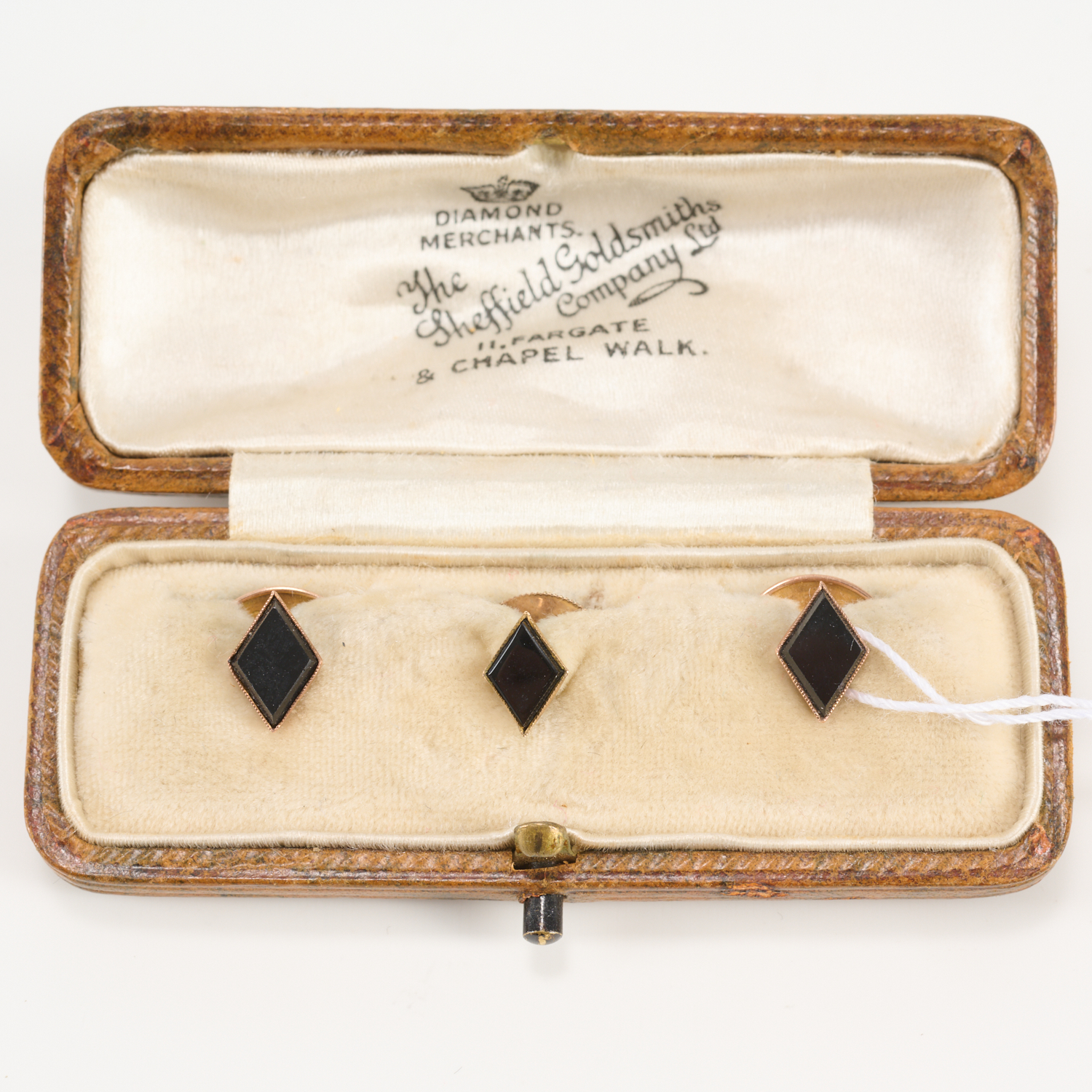 A SET OF THREE ONYX SET SHIRT STUDS IN 9CT GOLD, BOXED, 2.1GMS