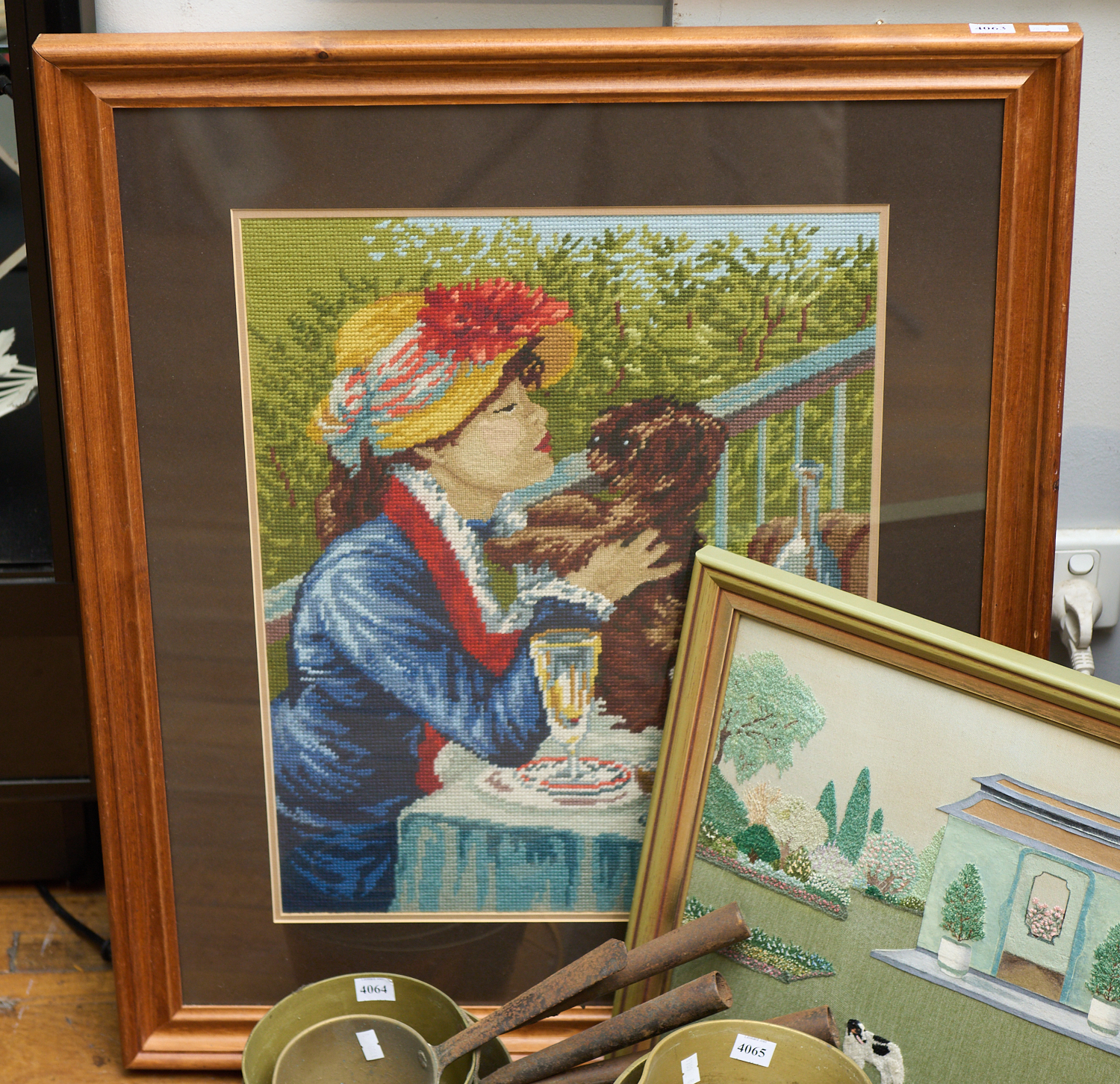 A FRAMED TAPESTRY OF A LADY WITH A DOG H 73 X W 61CM, LEONARD JOEL LOCAL DELIVERY SIZE: SMALL