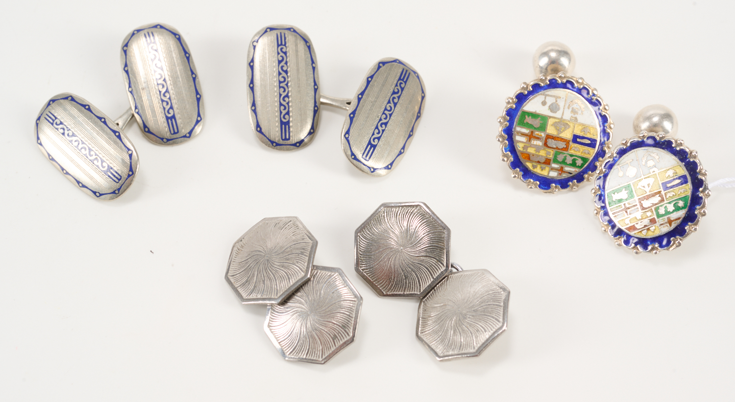 THREE PAIRS OF CUFFLINKS IN SILVER, INCLUDING TWO PAIRS WITH ENAMEL DETAIL
