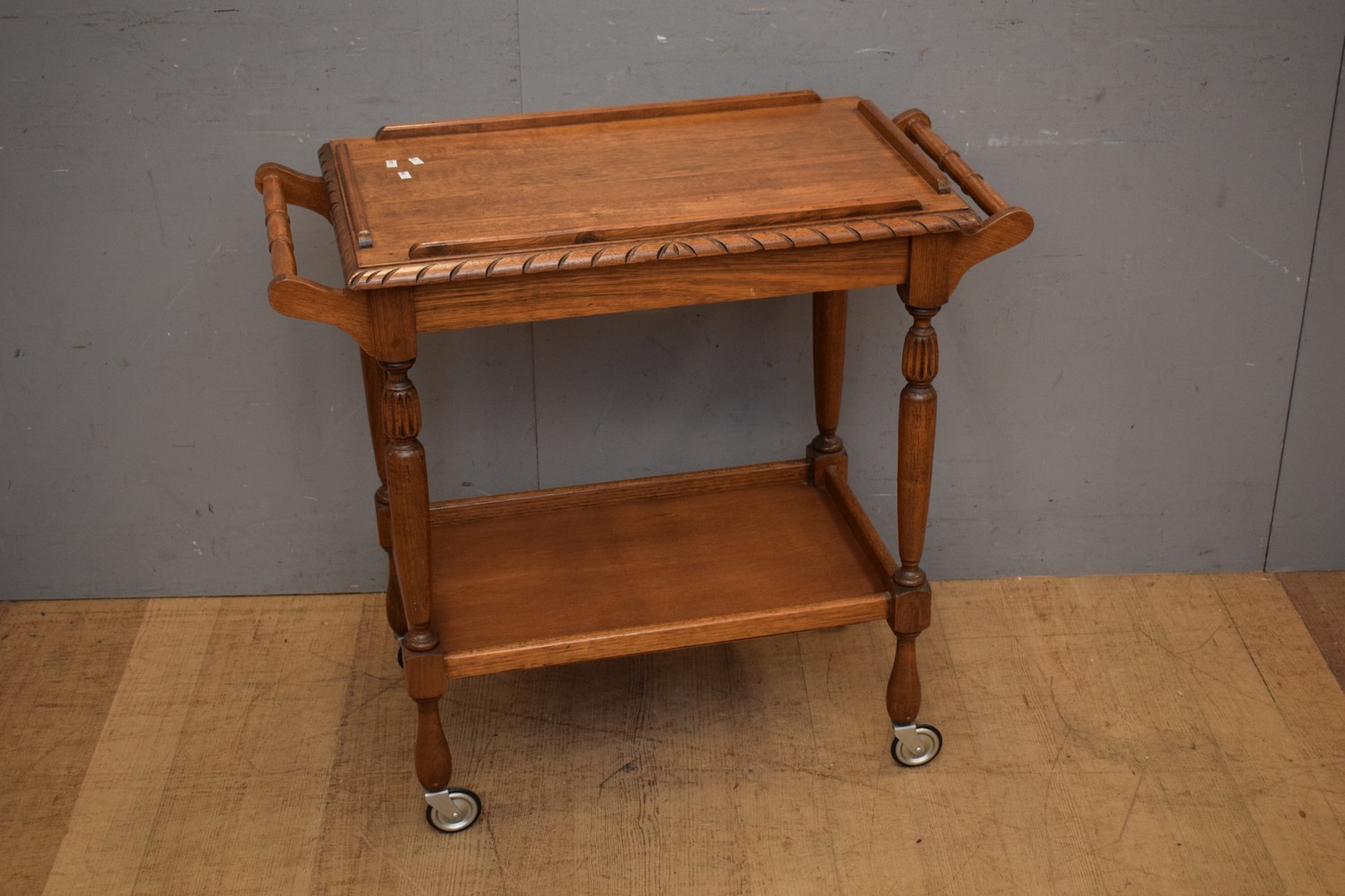 AN OAK TWO TIER AUTO TROLLEY WITH CARVED DETAILING (81H x 86W x 46D CM) (LEONARD JOEL DELIVERY SIZE: LARGE)