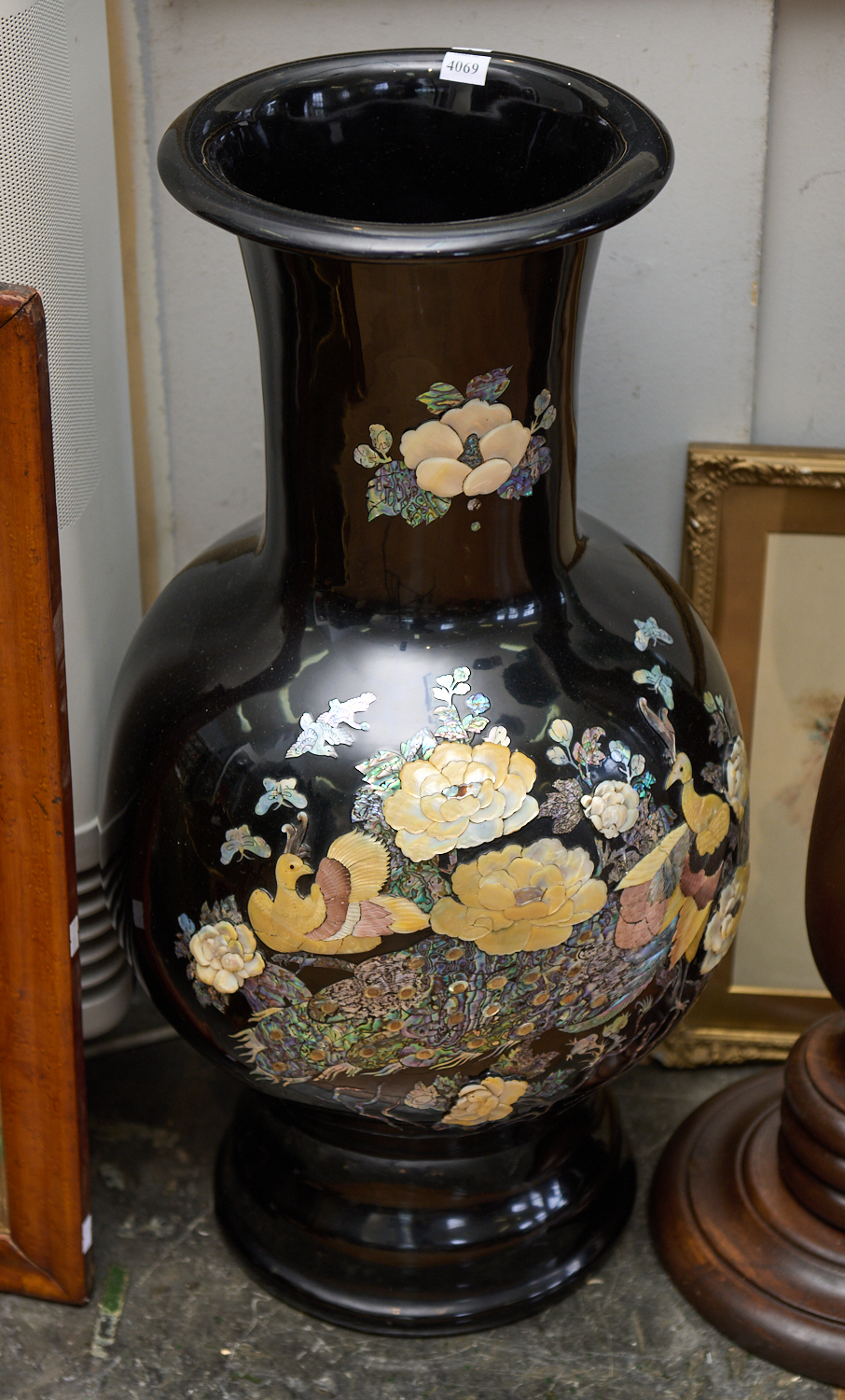 A LACQUER AND INLAID MOTHER OF PEARL VASE H 74 CM, LEONARD JOEL LOCAL DELIVERY SIZE: MEDIUM