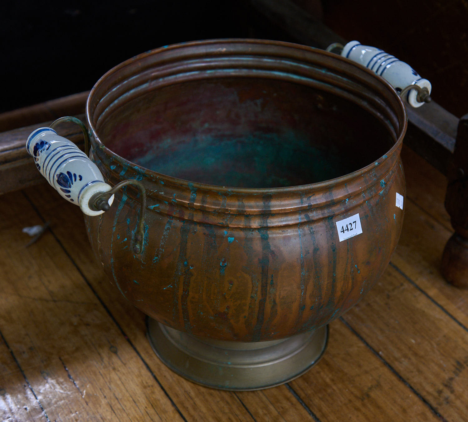 A COPPER AND PORCELAIN HANDLED PLANTER DIA. 28CM, LEONARD JOEL LOCAL DELIVERY SIZE: SMALL