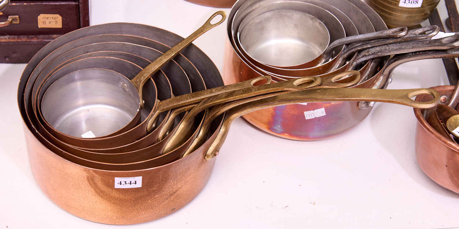 A SET OF SIX FRENCH COPPER AND BRASS HANDLED SAUCEPANS, LEONARD JOEL LOCAL DELIVERY SIZE: SMALL