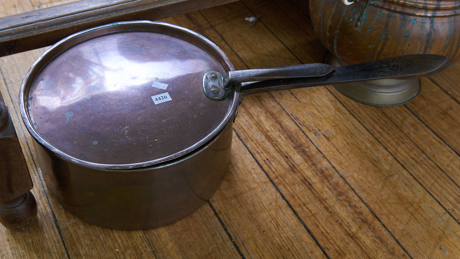 A FRENCH COPPER AND STEEL HANDLED SAUCEPAN WITH LID DIA. 31 CM, LEONARD JOEL LOCAL DELIVERY SIZE: SMALL