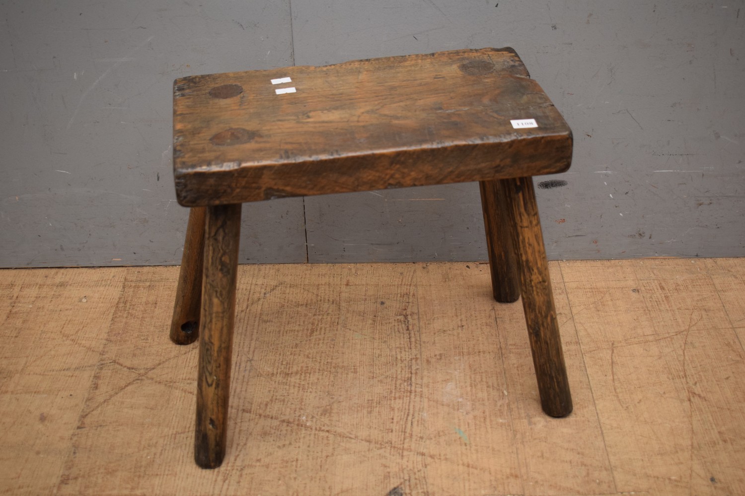 AN OAK FRENCH FARMHOUSE STYLE MILKING STOOL (40H x 41W x 23D CM) (LEONARD JOEL DELIVERY SIZE: MEDIUM)