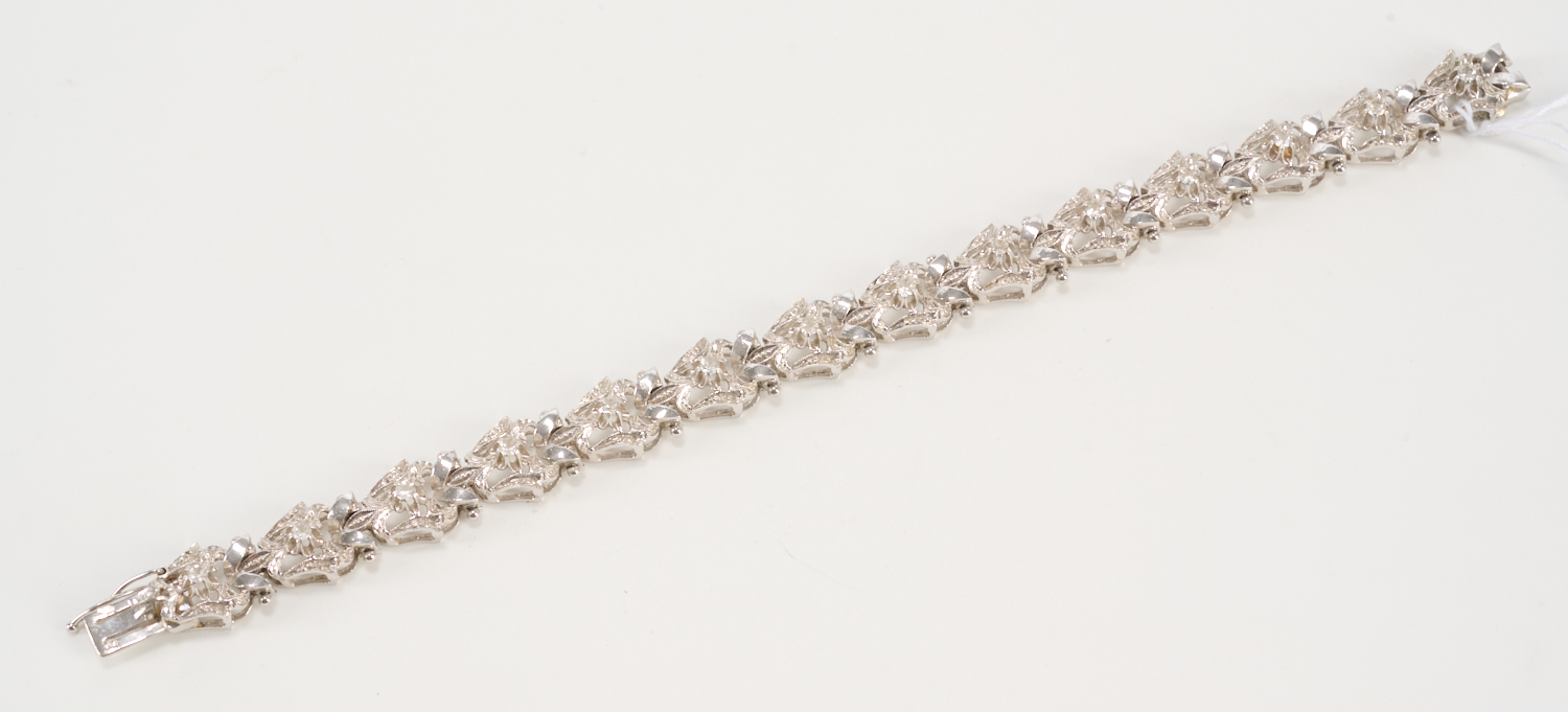 A SYNTHETIC WHITE SPINEL SET FOLIATE LINK BRACELET IN 18CT WHITE GOLD, WITH TONGUE AND GROOVE CLASP, TOTAL WEIGHT 30.6GMS, WITH VALUATION
