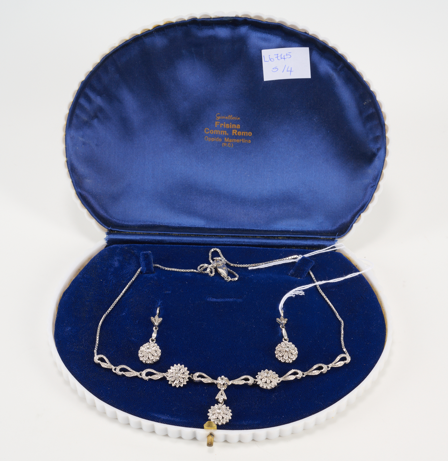 A SYNTHETIC WHITE SPINEL FOLIATE NECKLACE IN 18CT WHITE GOLD, ALONG WITH CONFORMING PAIR OF PENDANT EARRINGS IN 18CT WHITE GOLD, TO SHEPHERD CLASPS, WITH BOX AND VALUATION, TOTAL WEIGHT