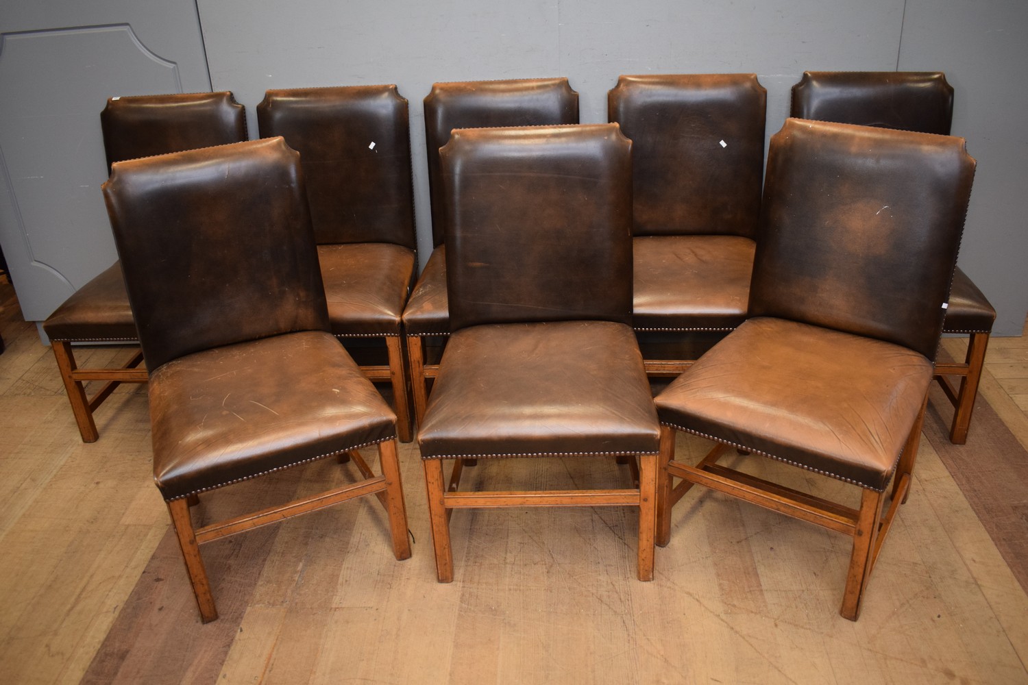A SET OF EIGHT SUBSTANTIAL BROWN LEATHER UPHOLSTERED DINING CHAIRS (A/F) (101H x 58W x 62D CM) (PLEASE NOTE THIS HEAVY ITEM MUST BE REMOVED BY CARRIERS AT THE CUSTOMER'S EXPENSE. LEONARD JOEL STAFF CANNOT ASSIST CARRYING THIS ITEM) (X-LARGE ITEM)