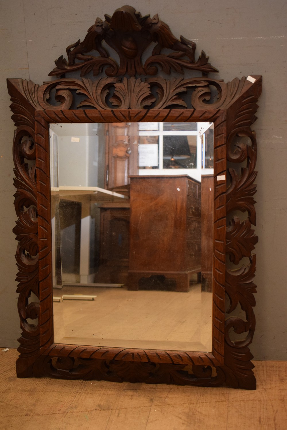 A FRENCH HENRI II STYLE MIRROR IN OAK (A/F) ( 108H X 73W CM) (LEONARD JOEL DELIVERY SIZE: LARGE)