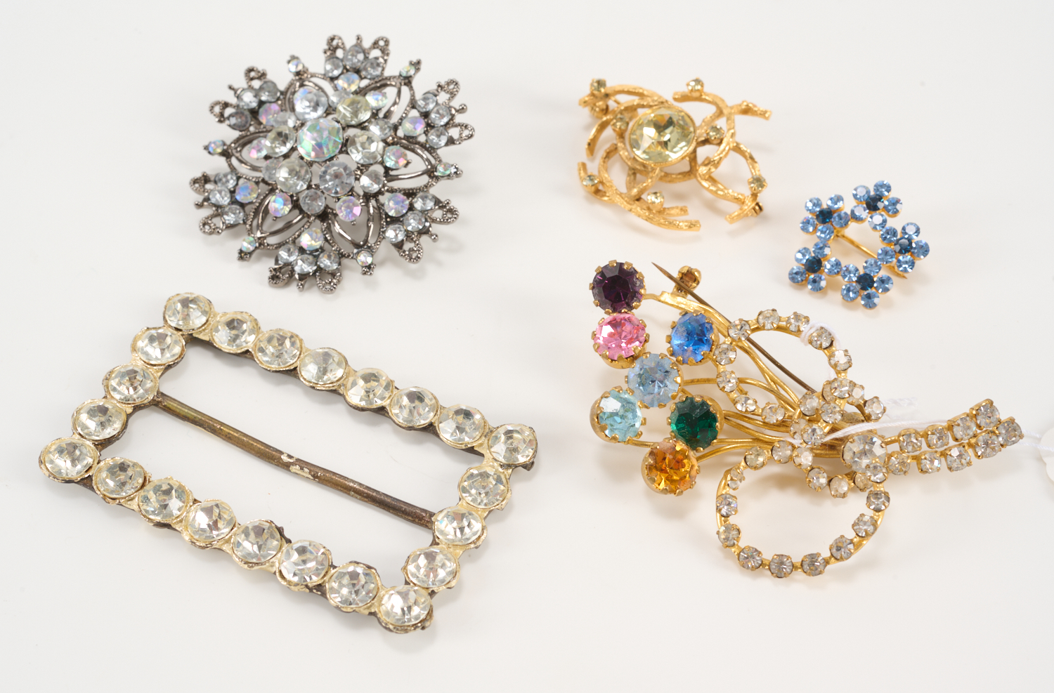 A COLLECTION ON FIVE VINTAGE COSTUME JEWELS INCLUDING 4 FLORAL BROOCHES, ONE PASTE-SET BUCKLE