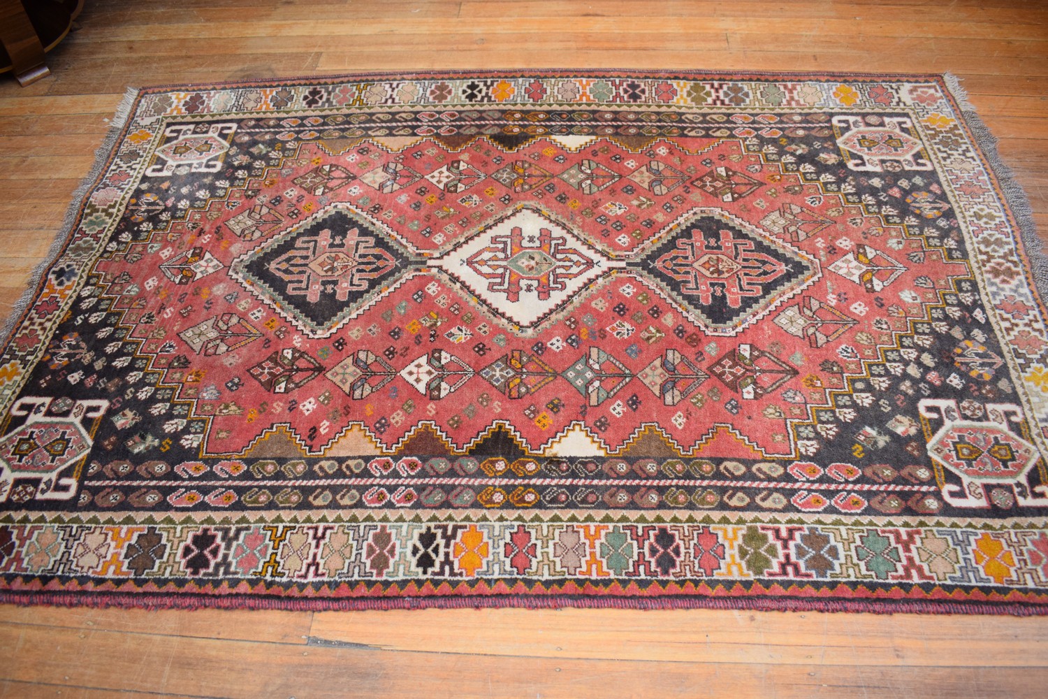 A HAND MADE WOOLEN RUG WITH A DIAMOND MEDALLION DESIGN IN TONES OF RED AND BROWN (A/F) (260 CM X 175 CM)