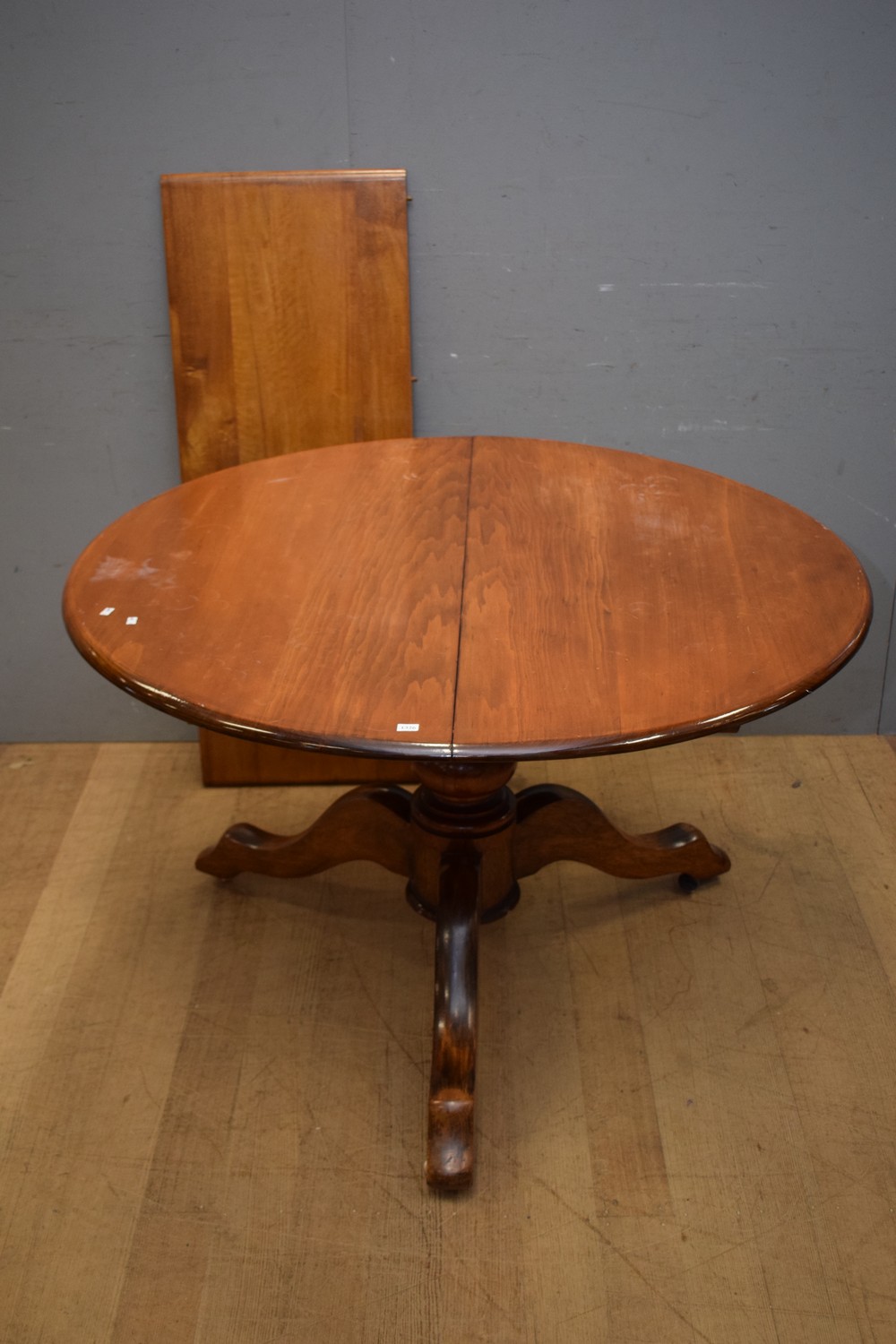 A ROUND EXTENSION DINING TABLE ON A VICTORIAN BASE WITH ONE LEAF (A/F) (73H x 119D CM) (PLEASE NOTE THIS HEAVY ITEM MUST BE REMOVED BY CARRIERS AT THE CUSTOMER'S EXPENSE. LEONARD JOEL STAFF CANNOT ASSIST CARRYING THIS ITEM) (X-LARGE ITEM)
