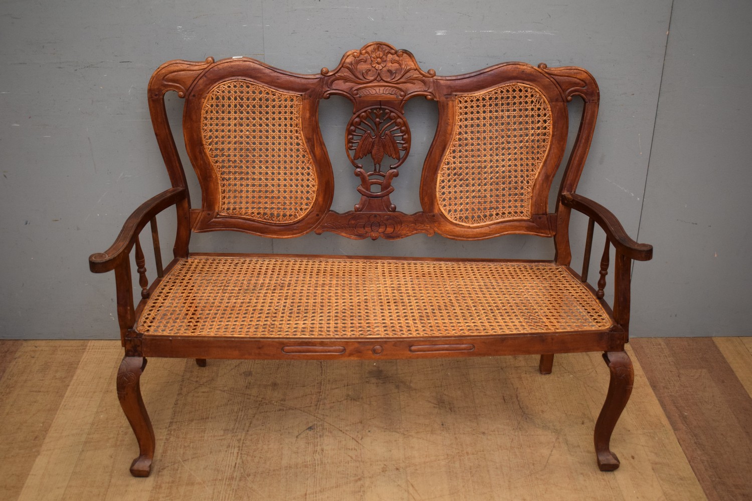 A TEAK CANUTO BENCH SEAT WITH RATTAN SEAT AND BACK (A/F) (97H x 132W x 55D CM) (LEONARD JOEL DELIVERY SIZE: LARGE)
