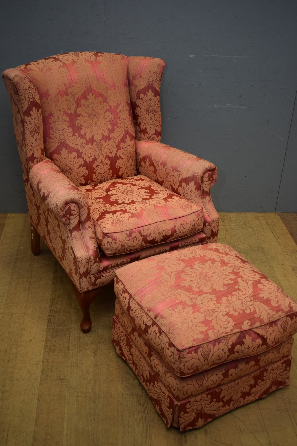 A WING BACK ARMCHAIR ON CABRIOLE LEGS WITH MATCHING OTTOMAN (101H x 81W x 87D CM) (LEONARD JOEL DELIVERY SIZE: LARGE)