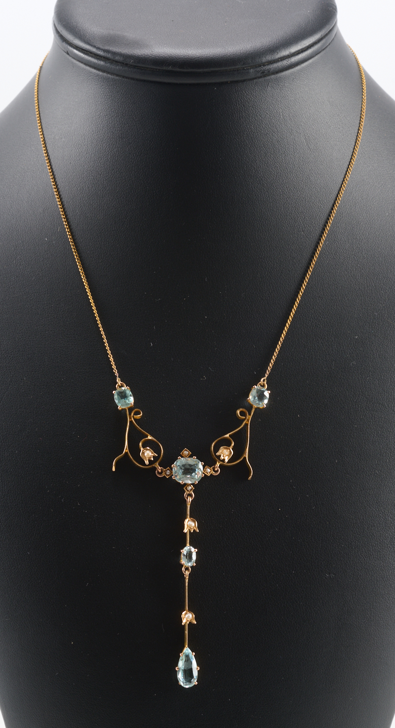 AM EDWARDIAN SEED PEARL AND AQUAMARINE NECKLACE IN 15CT GOLD PLATE TO A GOLD PLATED CHAIN, LENGTH 480MM