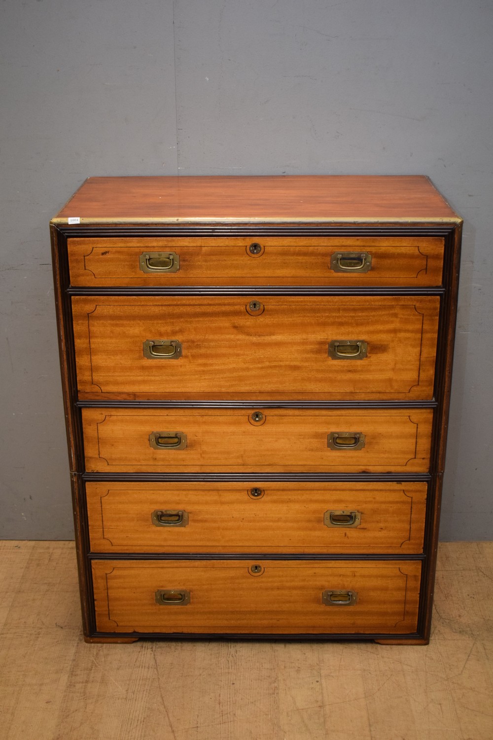 A NINETEENTH CENTURY BRASS BOUND CAMPAIGN DESK. ORIGINAL BRASS HARDWARE, KEY IN OFFICE. (A/F) (117H x 93W x 51D CM) (PLEASE NOTE THIS HEAVY ITEM MUST BE REMOVED BY CARRIERS AT THE CUSTOMER'S EXPENSE. LEONARD JOEL STAFF CANNOT ASSIST CARRYING THIS ITEM) (X-LARGE ITEM)
