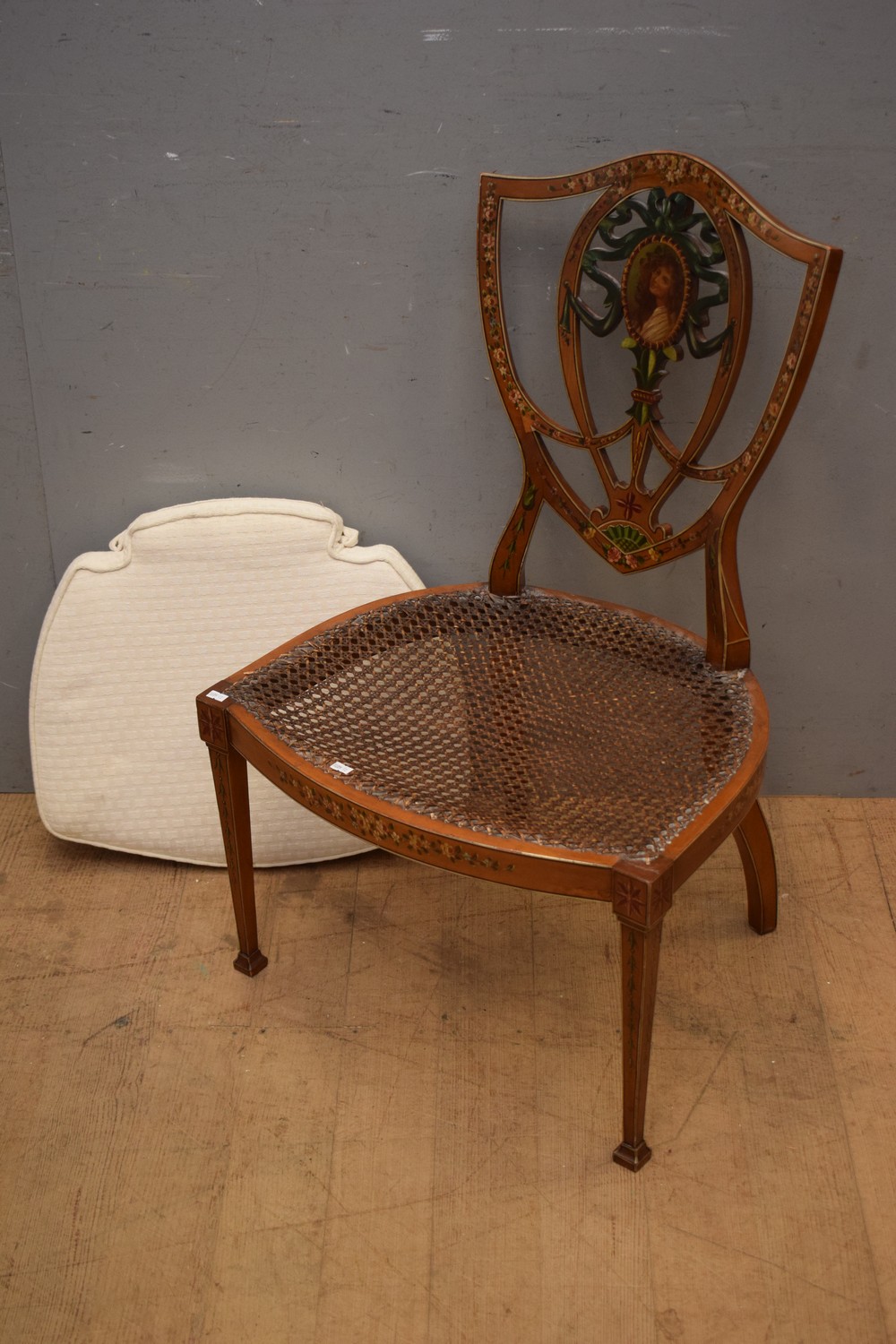 AN EMPIRE STYLE OCCASIONAL CHAIR WITH RATTAN SEAT AND HAND PAINTED DETAIL (A/F) ( 88H X 57W X 48D CM) (LEONARD JOEL DELIVERY SIZE: LARGE)
