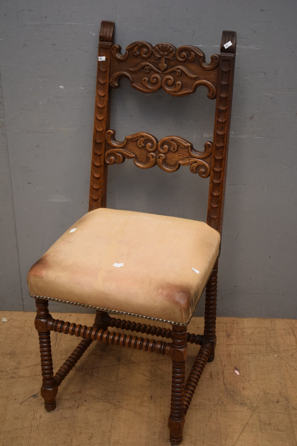A NINETEENTH CENTURY ORNATE LEATHER AND TIMBER HALL CHAIR (A/F) ( 107H X 47W X 48D CM) (LEONARD JOEL DELIVERY SIZE: LARGE)