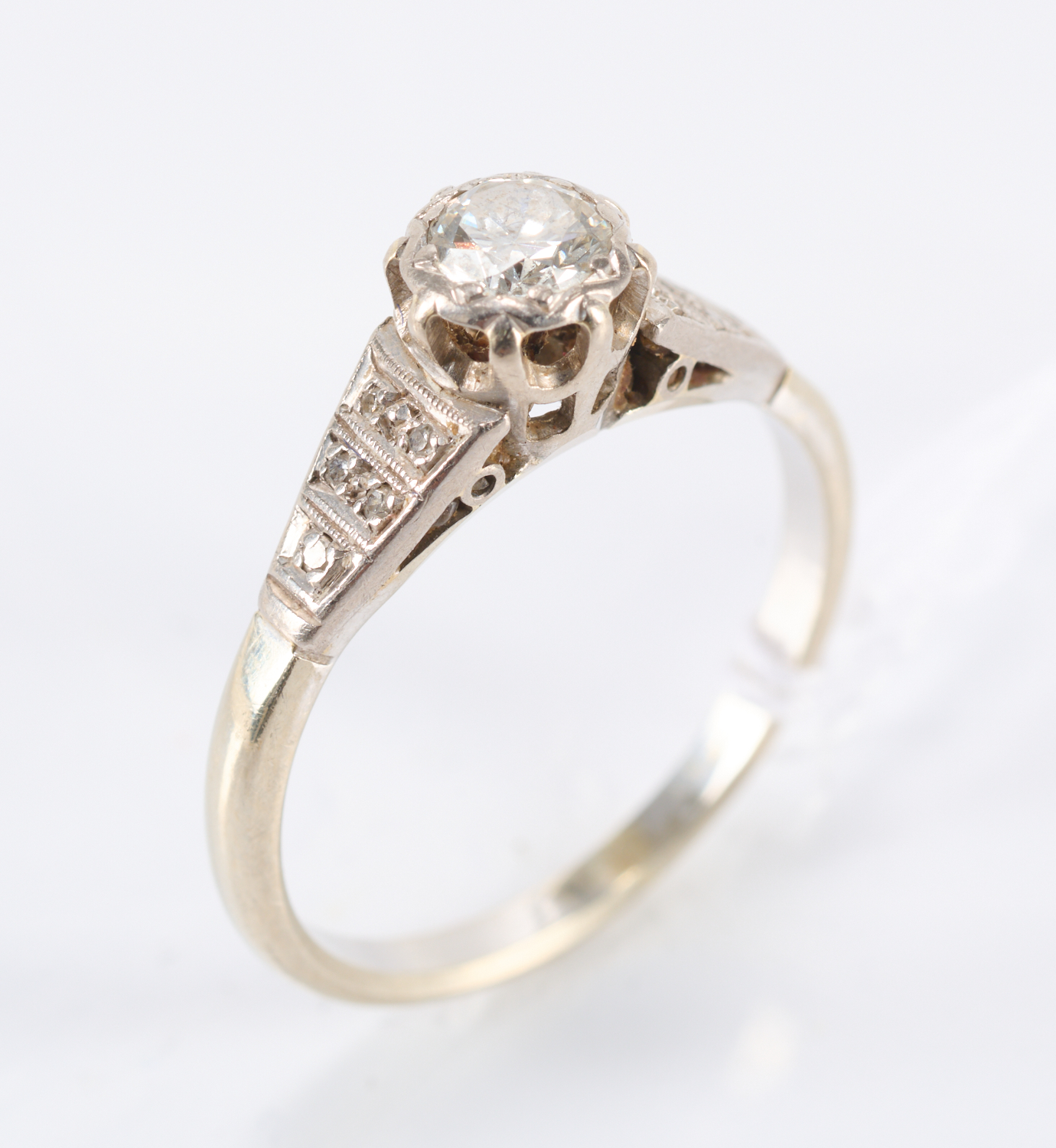 AN DIAMOND RING IN 18CT WHITE GOLD, SET WITH A BRILLIANT CUT DIAMOND WEIGHING APPROXIMATELY 0.35CTS BETWEEN SING CUT DIAMOND SHOULDERS, RING SIZE O