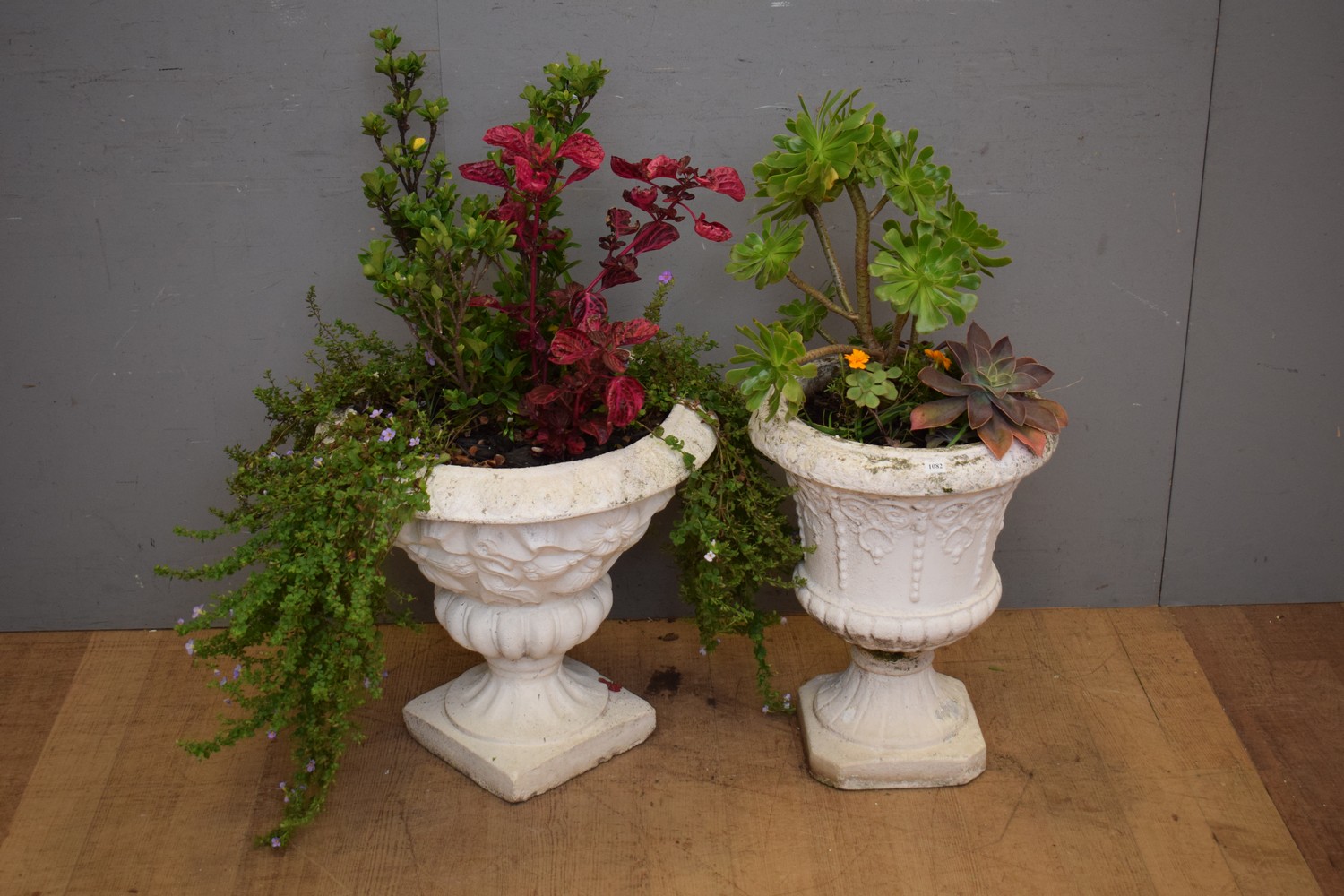 TWO CONCRETE CLASSICAL STYLE URNS (A/F) (55H x 57D CM) (PLEASE NOTE THIS HEAVY ITEM MUST BE REMOVED BY CARRIERS AT THE CUSTOMER'S EXPENSE. LEONARD JOEL STAFF CANNOT ASSIST CARRYING THIS ITEM) (X-LARGE ITEM)