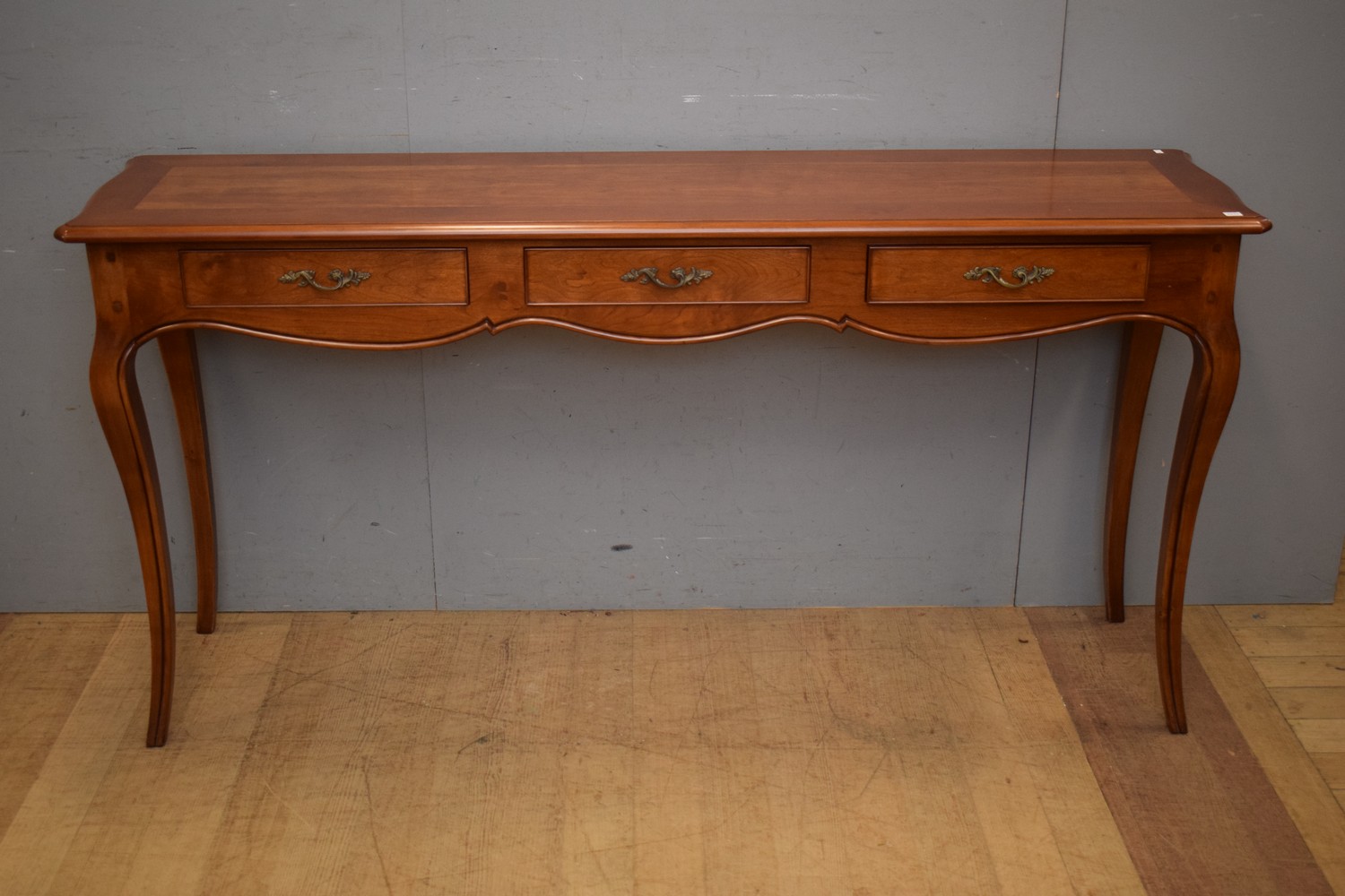 A 'LESLIE JONES' FRENCH PROVINCIAL STYLE OAK THREE DRAWER HALL CONSOLE (88H x 180W x 47D CM) (PLEASE NOTE THIS HEAVY ITEM MUST BE REMOVED BY CARRIERS AT THE CUSTOMER'S EXPENSE. LEONARD JOEL STAFF CANNOT ASSIST CARRYING THIS ITEM) (X-LARGE ITEM)