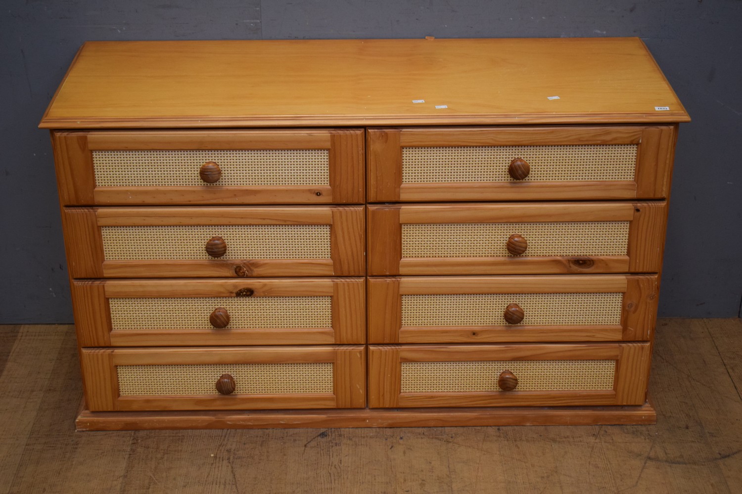 A CONTEMPORARY EIGHT DRAWER CHEST WITH RATTAN DETAILING (A/F) (71H x 119W x 45D CM) (LEONARD JOEL DELIVERY SIZE: LARGE)