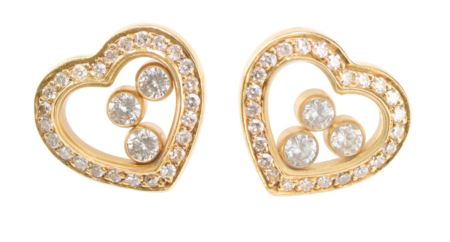 Each earring centring a heart-shaped glazed compartment framed by round brilliant-cut diamonds, enclosing three floating collets accented with round brilliant-cut diamonds, together weighing approximately 0.35 carats, to post and butterfly fittings, signed Chopard, accompanied by a Chopard box.
