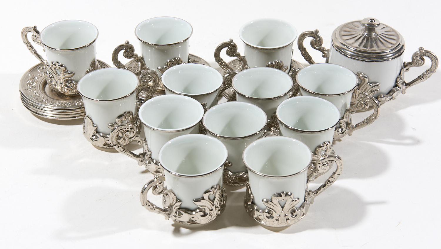 AN ITALIAN MONOPOLI PORCELAIN AND SILVERED METAL TEASET, LEONARD JOEL LOCAL DELIVERY SIZE: SMALL