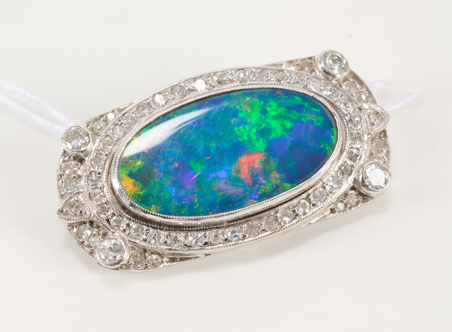 A VINTAGE OPAL DOUBLET AND DIAMOND BROOCH IN 14CT WHITE GOLD