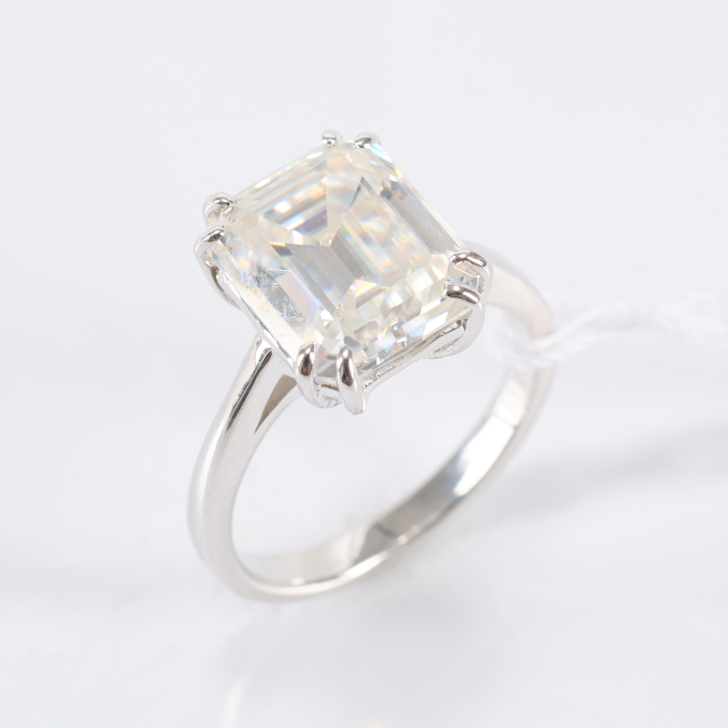 A MOISSANITE SET RING IN 18CT WHITE GOLD, THE EMERALD CUT MOISSANITE TOTALLING 4.92CTS, RING SIZE L/M, 4.7GMS