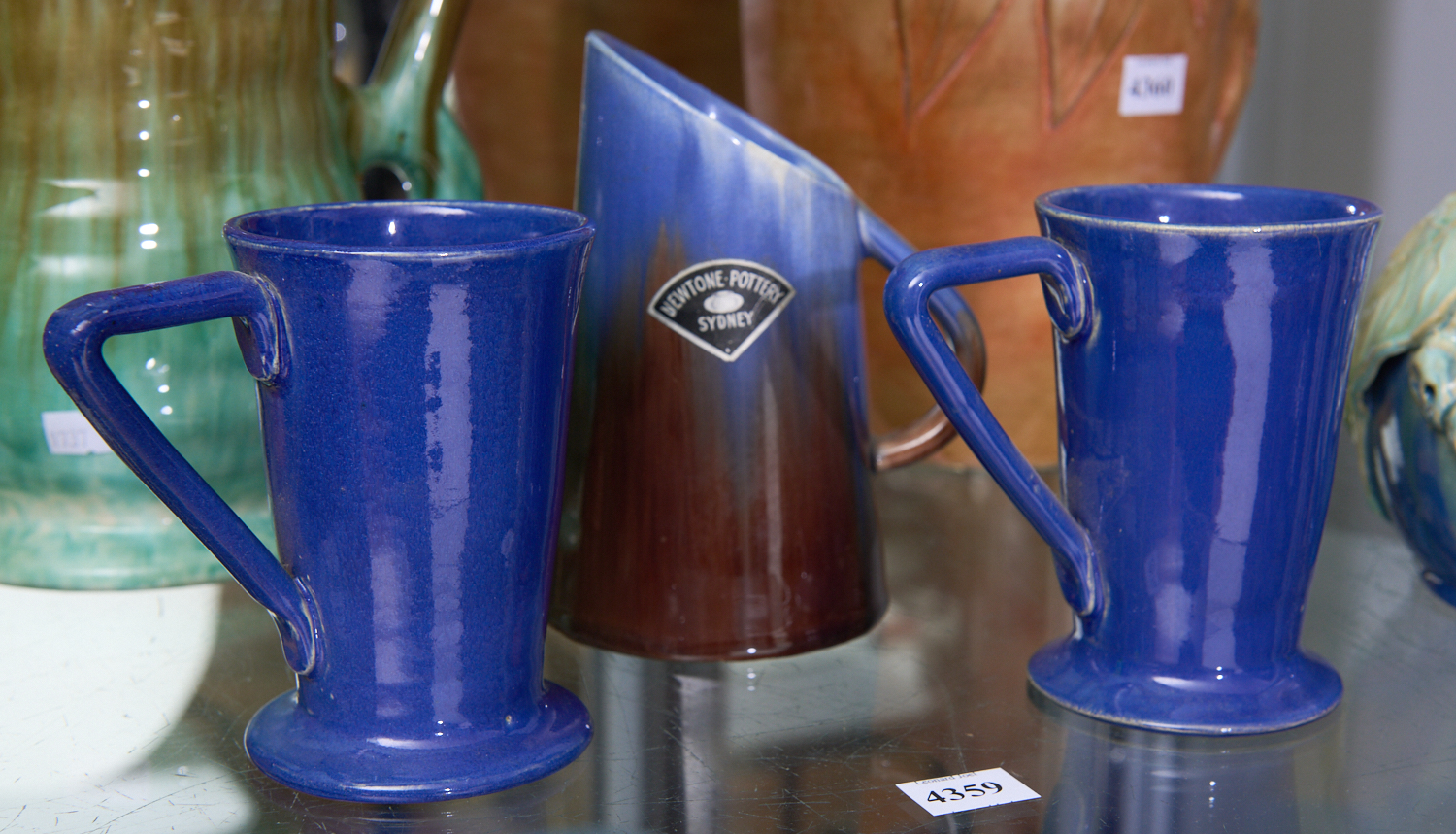 A GROUP OF THREE AUSTRALIAN POTTERY ITEMS INCLUDING TWO REMUED MUGS, LEONARD JOEL LOCAL DELIVERY SIZE: SMALL