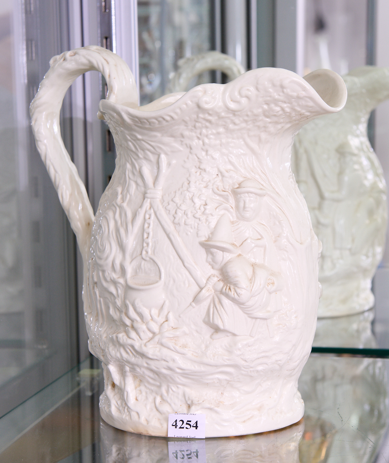 AN OLD STAFORDSHIRE PORCELAIN PITCHER (A/F), LEONARD JOEL LOCAL DELIVERY SIZE: SMALL