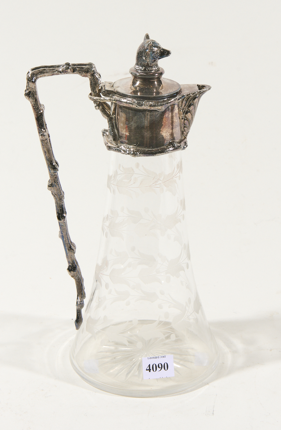 A CLARET JUG, SILVER PLATED HANDLE AND LID WITH FOX HEAD FINIAL, LEONARD JOEL LOCAL DELIVERY SIZE: SMALL