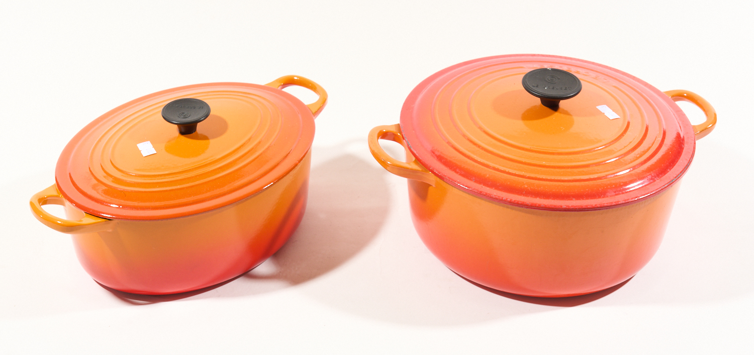 TWO ORANGE LE CREUSET CAST IRON CASSEROLE POTS, LEONARD JOEL LOCAL DELIVERY SIZE: SMALL