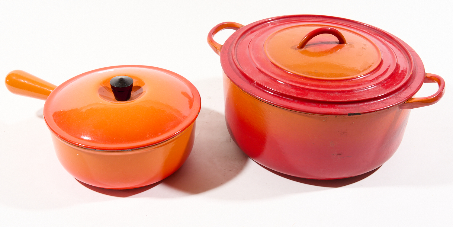 TWO ORANGE LE CRUESET CAST IRON POTS, LEONARD JOEL LOCAL DELIVERY SIZE: SMALL