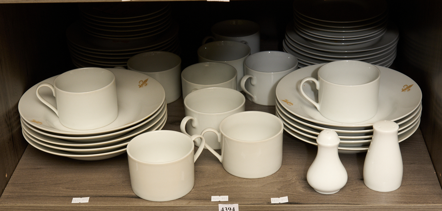 A SHELF OF UNIVERSAL DINNERWARE WITH PLATES AND CUPS, LEONARD JOEL LOCAL DELIVERY SIZE: SMALL. The Rodney Permezel Collection