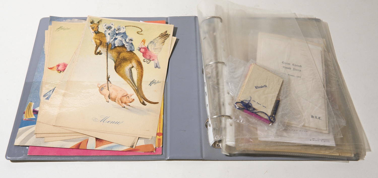FOLDER WITH INVITATIONS AND ASSORTED PAPER EPHEMERA TOGETHER WITH A DESK PAD, LEONARD JOEL LOCAL DELIVERY SIZE: SMALL. The Rodney Permezel Collection
